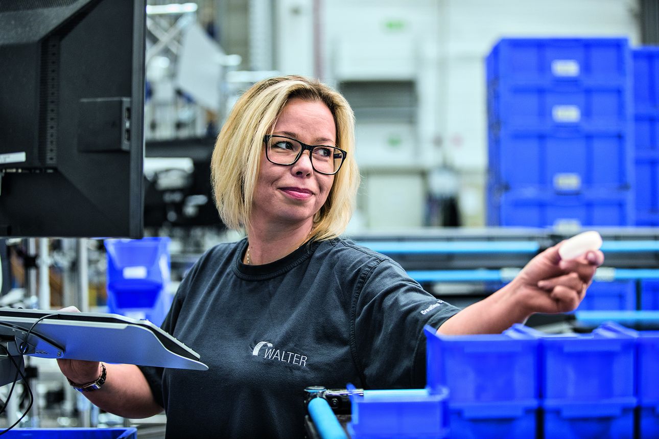 Aus der mechanischen Fertigung in Kuřim gehen die Teile entweder direkt in die Montage oder, bis sie gebraucht werden, in ein Storage-System mit automatisierter Lagerverwaltung. In einem ebenfalls automatisierten Hochregallager in einer Nachbarhalle werden Kleinteile für die Montage vorrätig gehalten. Logistikerin Petra Kupková und ihre Kollegen machen sie nach Bedarf für die interne Belieferung fertig. In ihren 16 Jahren bei Walter s.r.o. hat Petra Kupková alle Schritte der fortschreitenden Automatisierung des Lagers miterlebt. Nun werden alle Logistiksysteme in Kuřim – die Beschaffungs-, Produktions-, Lager- und Distributionslogistik – in einem übergreifenden Projekt optimiert und zusammengeführt.