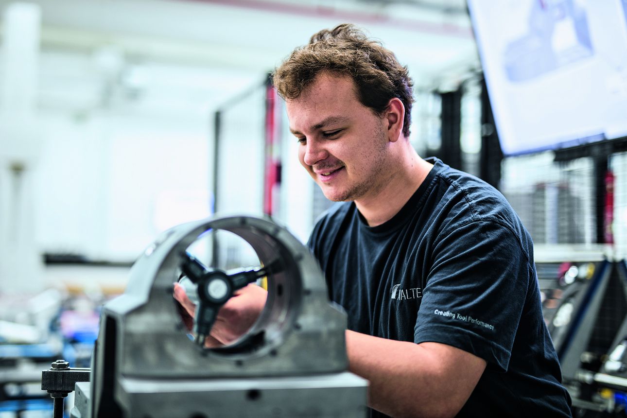 EINE GROSSE, SEHR HELLE, sehr saubere Produktionshalle. Der oft im Maschinenbau anzutreffende Geruch nach warmem Metall, er fehlt hier völlig. Vorne links an einem großen Bearbeitungszentrum stehen zwei junge Männer in den obligatorischen grauen WALTER-Shirts, schauen in den Maschineninnenraum und diskutieren miteinander. Hinten rechts startet ein etwas älterer Mitarbeiter den Prüfzyklus an einer Messmaschine.