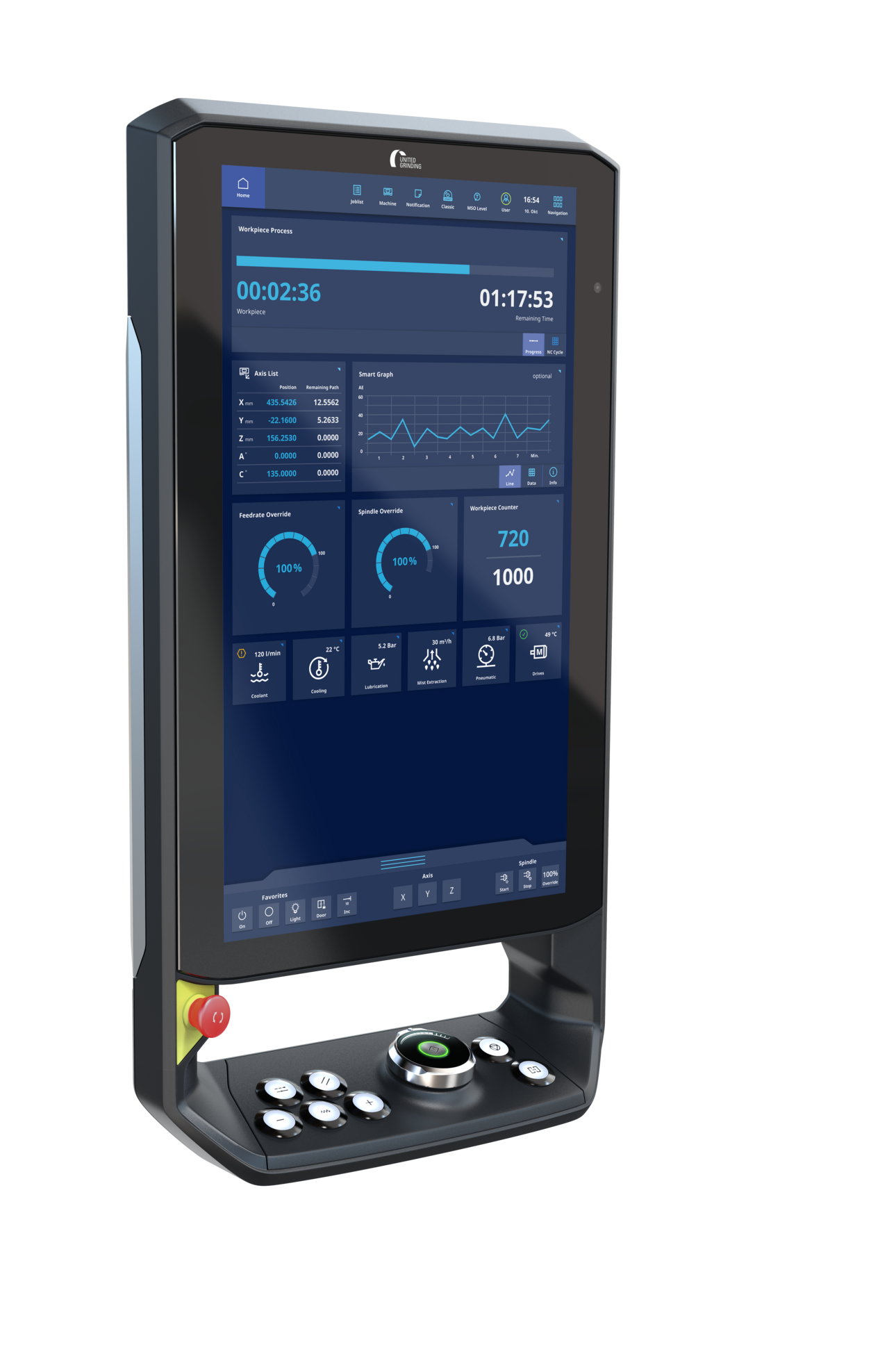 Mit C.O.R.E. hat die UNITED GRINDING Group ein neuartiges Maschinen-Interaktions-Konzept geschaffen, aufgebaut auf einer modernen Hard- und Software-Architektur. Die Bedienung sämtlicher Werkzeugmaschinen der UNITED GRINDING Group wird damit vereinheitlicht, über das neue 24-Zoll-Multitouch C.O.R.E. Panel intuitiv wie ein Smartphone gesteuert und kann ausserdem nach individuellen Vorlieben personalisiert werden. Das aufgeräumte Design des C.O.R.E. Panels mit nur wenigen Tasten, erleichtert die Übersicht. Und auch die virtuellen Funktionstasten werden nur bei Bedarf angezeigt, was die Komplexität und damit die Fehleranfälligkeit reduziert. Die rollenspezifische Oberfläche, mit der Möglichkeit die Anzeige auf die relevanten Informationen der Benutzerrolle zu beschränken, trägt weiterhin zu einer Vereinfachung bei. So erleichtert C.O.R.E. den Nutzerinnen und Nutzern die Arbeit nicht nur bei der Maschinenbedienung, sondern auch bei der Maschineneinrichtung und Instandhaltung. Ein neuartiges Feature ist ausserdem die integrierte Frontkamera, über die eine schnelle und einfache Unterstützung auch über Video-Calls direkt am Panel möglich ist.