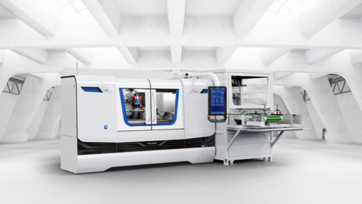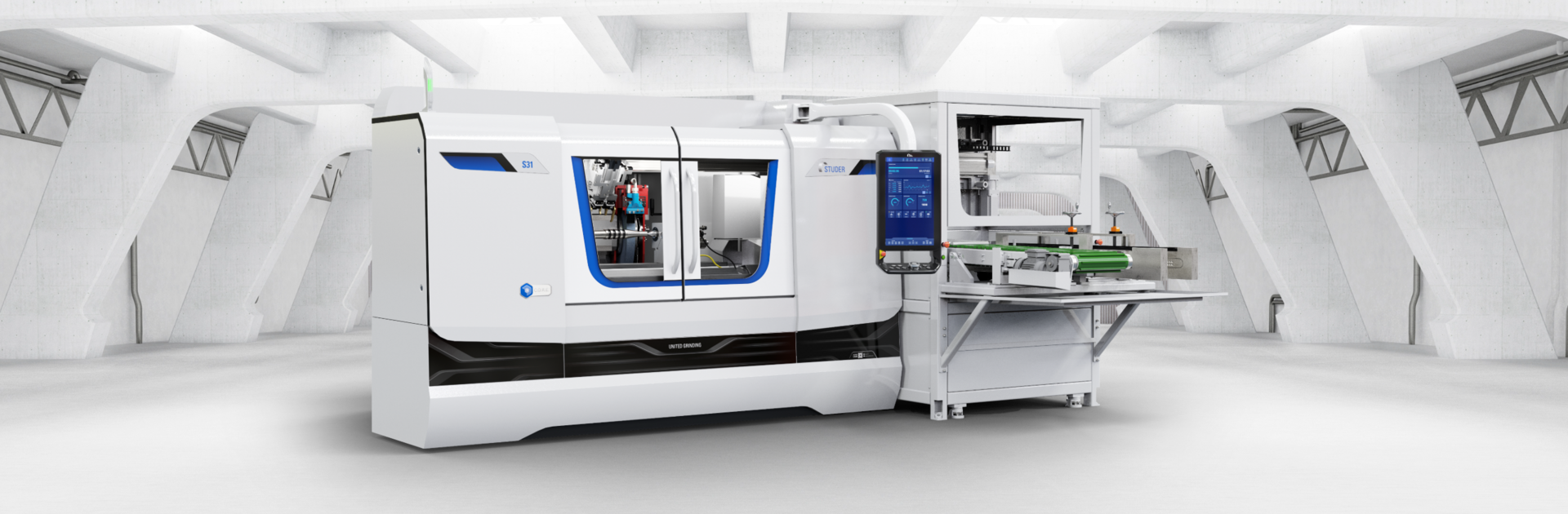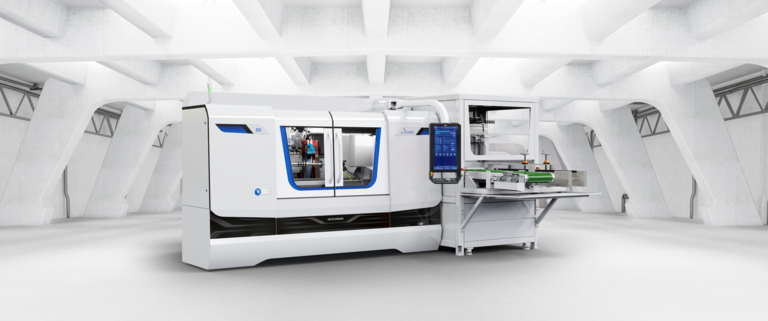 Für die Maschinentypen S31, S33, S22 und S41 wird eine Laderlösung auf Basis eines Portalladersystems mit V-Greifer angeboten. Das Ladersystem eignet sich für Wellenteile bis zu einer Teilelänge von 300 mm und einem Greifdurchmesser von 4 bis 30 mm (max. Störkontur - Ø 50 mm) und deckt damit einen Grossteil der auf diesen Maschinen gefertigten Teilespektren ab. Die Teilebereitstellung erfolgt über ein standardisiertes, verstellbares Taktband. Die an das Maschinendesign angepasste Umhausung des Basismoduls erlaubt einen sicheren und sauberen Betrieb der Anlage.