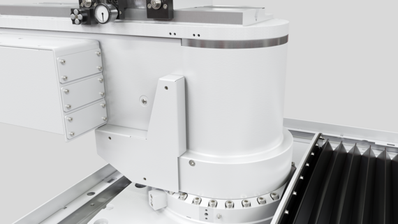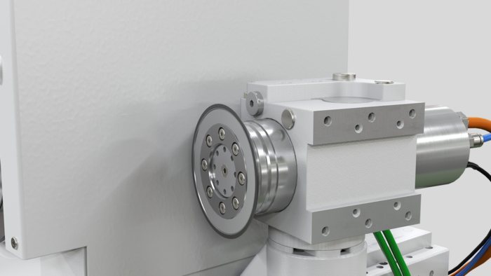 - Fully automatic workpiece swivel axis with direct drive and simultaneous interpolation with the X and Z axis. Swiveling range of -60° to +91°