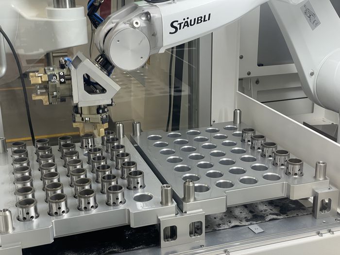 Soćko cite encore une autre raison de choisir la S110 : Sa capacité d'automatisation. Dans la cellule de chargement et de déchargement optionnelle, un robot prend les pièces brutes dans une palette, les serre dans la machine et dépose les manchons rectifiés dans une autre palette. Ce processus ne dure que quelques secondes par douille. La S110 peut ainsi fonctionner de manière autonome pendant au moins une heure sans intervention humaine et des fonctions internes facilitent le contrôle qualité.