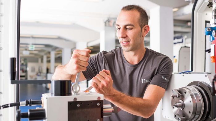 金曜日の午前7時30分 – Leica Geosystems AG社の生産ホール。STUDERのサービス技術者であるハンスペーター・ムンターは、約20年、50,000運転時間以上稼動して使用限度に達したスピンドルをS145cncから外します。彼は新しいスピンドルを設置し、専用の特殊工具で正確にセットアップします。このような期間運転するスピンドルでは、寸法精度の問題だけでなく、このS145cncのように振動や騒音の問題も出てきます。「すべてのカバープレートが取り外され、機械が開いたら、お客様と相談の上、B軸ベルトもすぐに交換し、それからタレットの位置を新たに調整します」とSTUDERで35年勤務しているハンスペーター・ムンターは説明します。彼は機械での高度な電気関連作業を得意としています。Leica Geosystems AG社での作業を彼は手際よく迅速に終えることができました。「どの仕事先でも私は全力で取り組みます。お客様にとって重要なのは、現場へ迅速に赴き、適切な交換部品を用意しておき、一刻も早く機械を再びスムーズに稼働できるようにすることです」と、自らの経験からムンターは語ります。これはSTUDERが提供できるサービスの一つです。「多くのお客様が何度もSTUDER