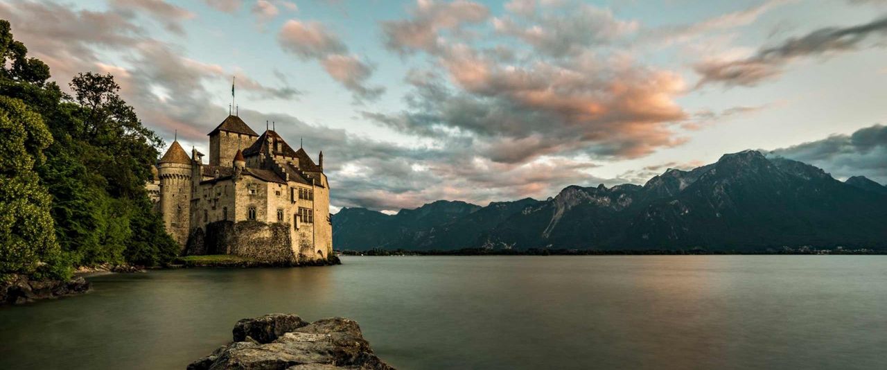 レマン湖のほとりの岩上に建てられ、水面に浮かんでいるようにみえる名城。中世にサヴォイア公の居城として使われていた歴史を誇り、スイスを代表する古城です。 山々に囲まれたレマン湖畔にある岩の島は、先史時代から人が居住していた歴史のある場所で、ローマ時代にはアルプス越えのサンベルナール峠から続く通商の道で、多くの船が行き交ったレマン湖の要所でもありました。